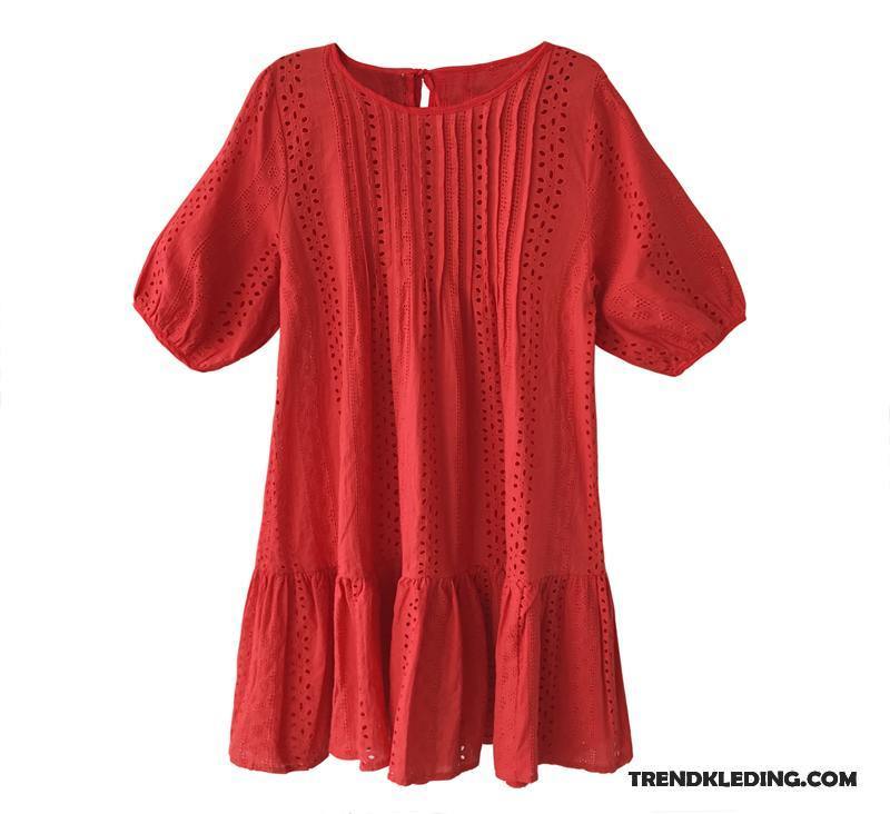 Jurk Dames Zomer Reis Katoen En Linnen Strand Kant Borduurwerk Zandkleur Rood