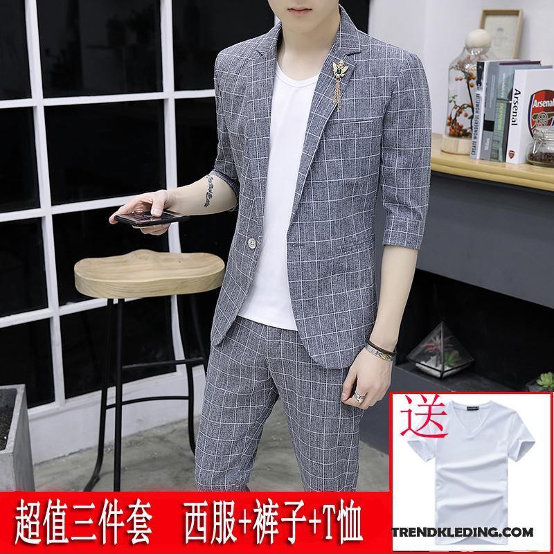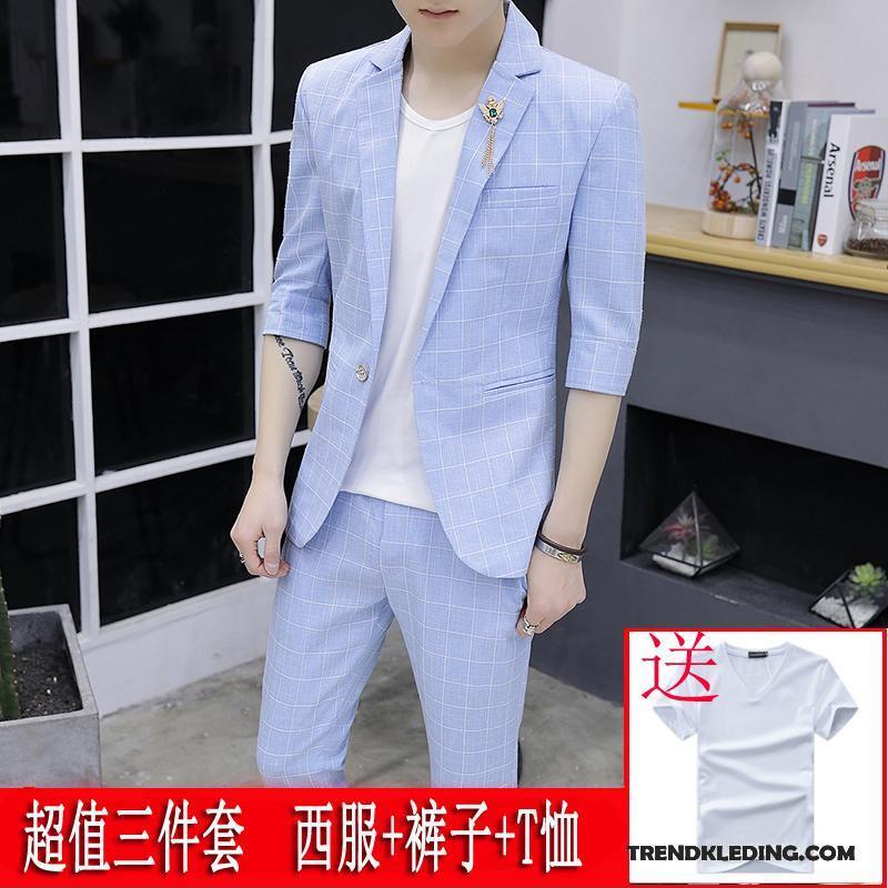 Kostuum Pak Heren Zomer Nieuw Trend Halve Mouw Dunne Slim Fit Hemelsblauw