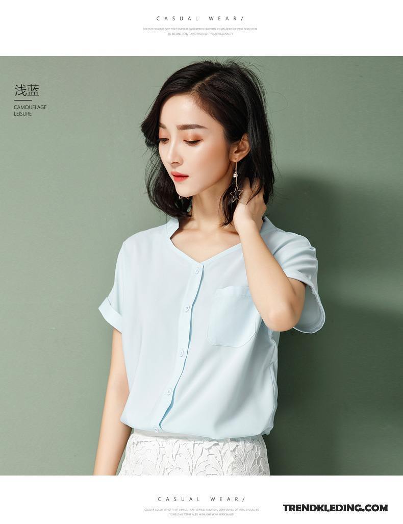 Overhemd Korte Mouw Dames V Hals Blouse Overhemd Chiffon Jasje Losse 2018 Wit Grijs