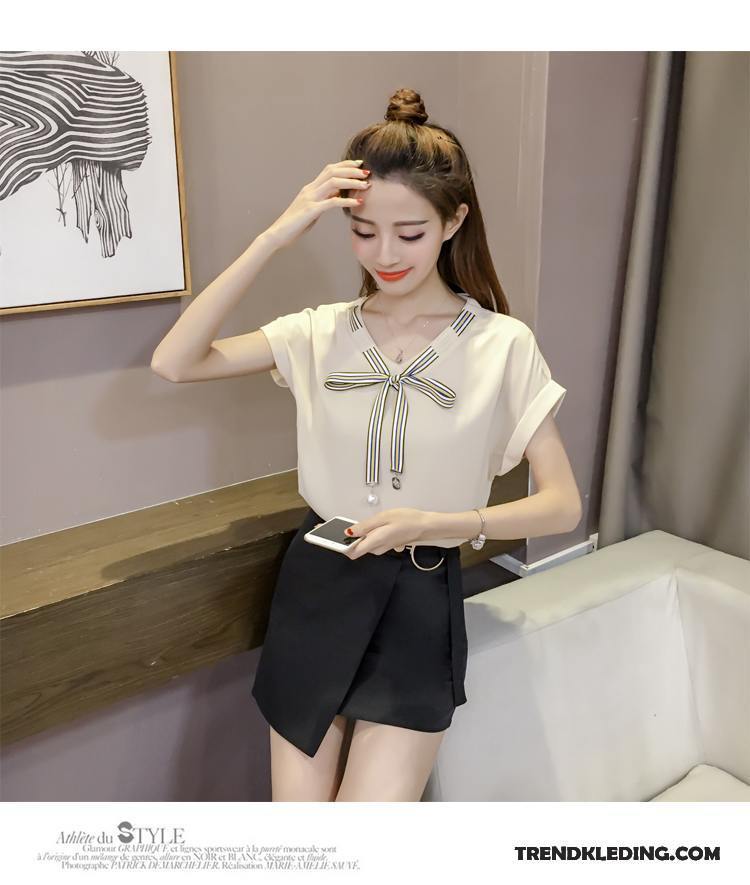 Overhemd Korte Mouw Dames Flare Broek 2018 Blouse Overhemd Halve Mouw Chiffon Nieuw Zwart