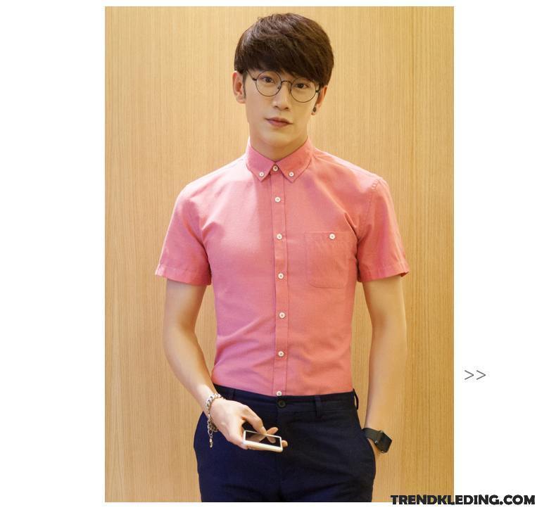 Overhemd Korte Mouw Heren Slim Fit Mooi Zomer Student Dunne Jeugd Effen Kleur Roze