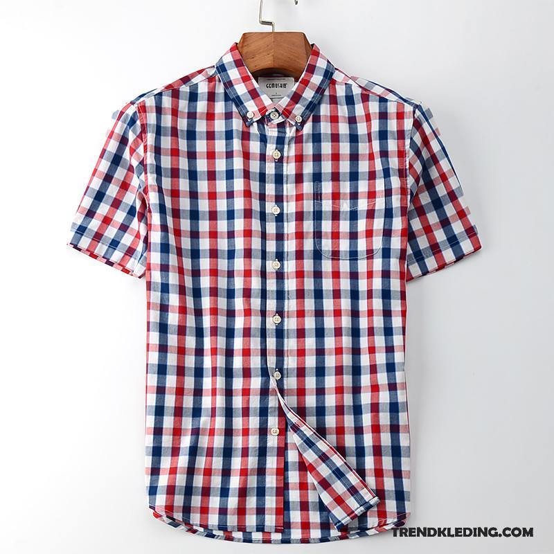 Overhemd Korte Mouw Heren Katoen Overhemd Kort Mouw Casual Eenvoudige Comfortabele Geruit Blauw