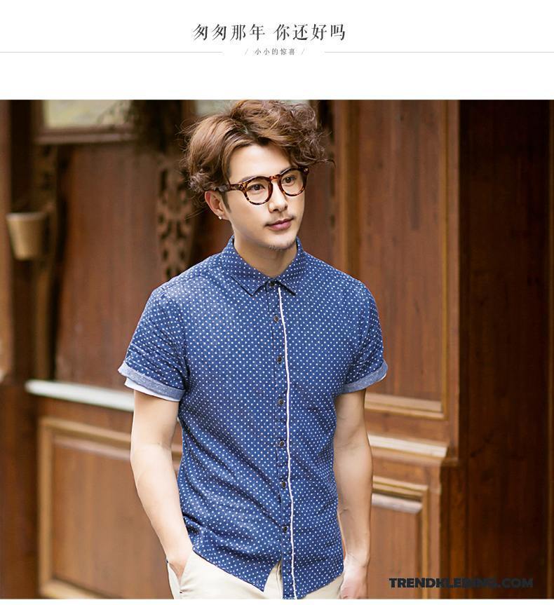 Overhemd Korte Mouw Heren Mannelijk Katoen Overhemd Kort Mouw Mode Denim Slim Fit Blauw Beige