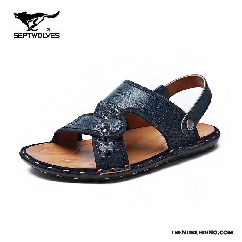 Sandalen Heren Strand Leer Wolf Sandaal Open Teen Casual Blauw Zandkleur